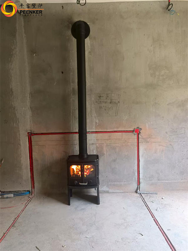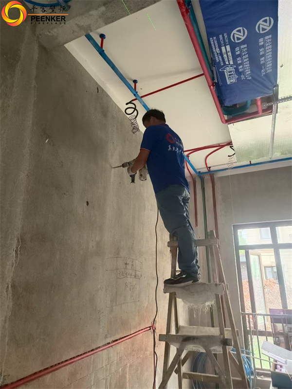 項目情況:該項目為雙拼別墅,壁爐安裝在客廳里,煙囪穿側墻出戶外加高,由平客壁爐項目部帶隊上門安裝。